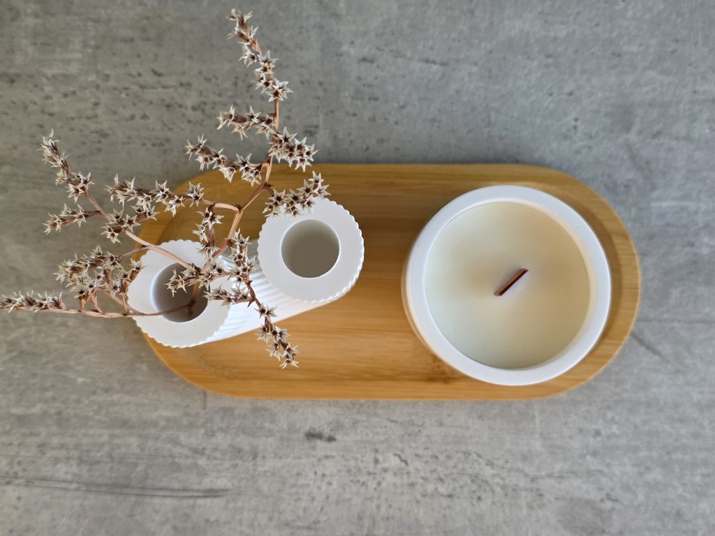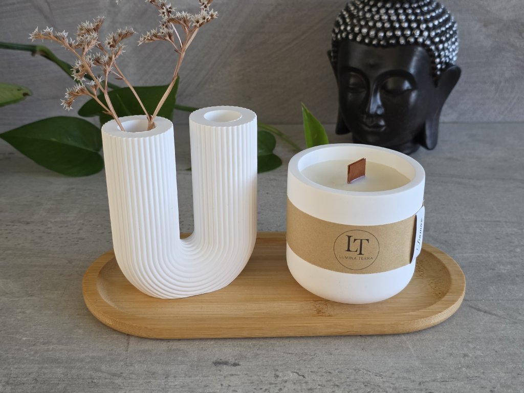 Ručně vyrobená sada vázy a sójové svíčky, včetně tácu z bambusového dřeva