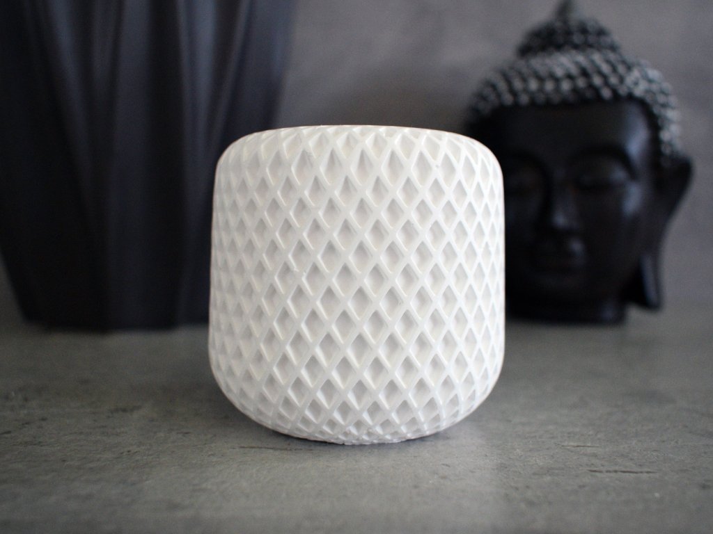 Každá nádoba je ručně odlévaná z kvalitní minerální hmoty, která je pevná, hladká a odolná. Tento moderní materiál je ekologickou alternativou k betonu či keramice – nesaje vosk, nepraská a působí elegantně minimalisticky.