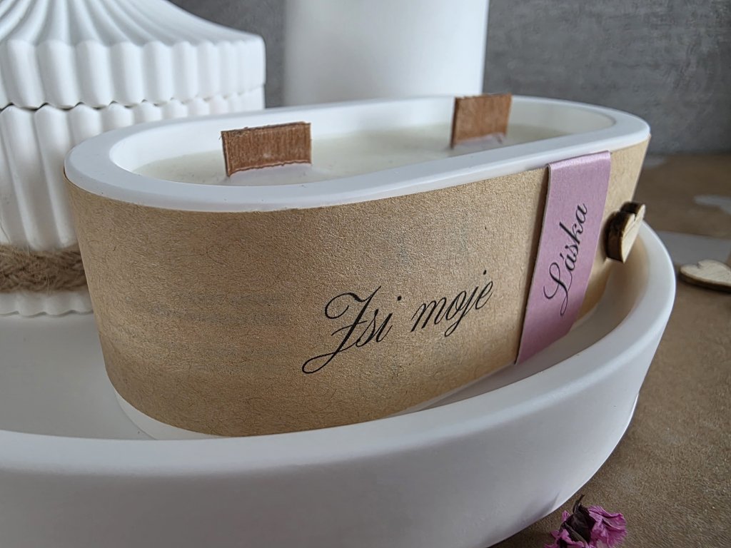 - svíčka: šířka 10 cm, výška 3,5 cm, objem vosku 55 ml, 2 dřevěné knoty