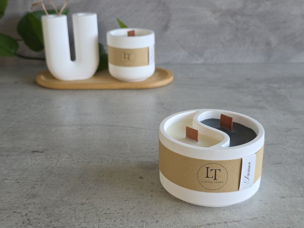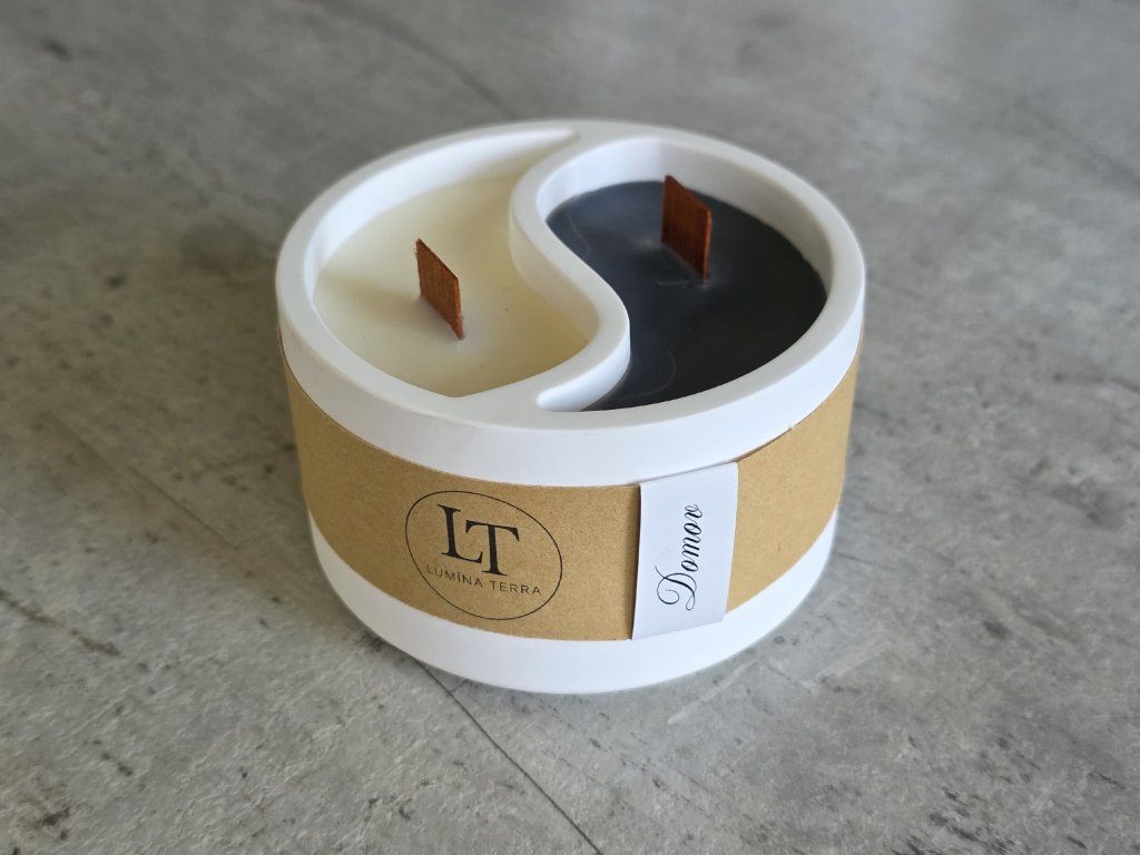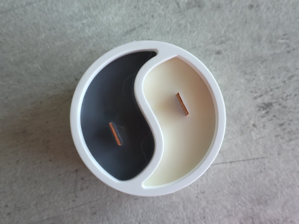 Sójová svíčka v tradičním symbolu reprezentující síly Jin a Jang (yin-yang symbol)
