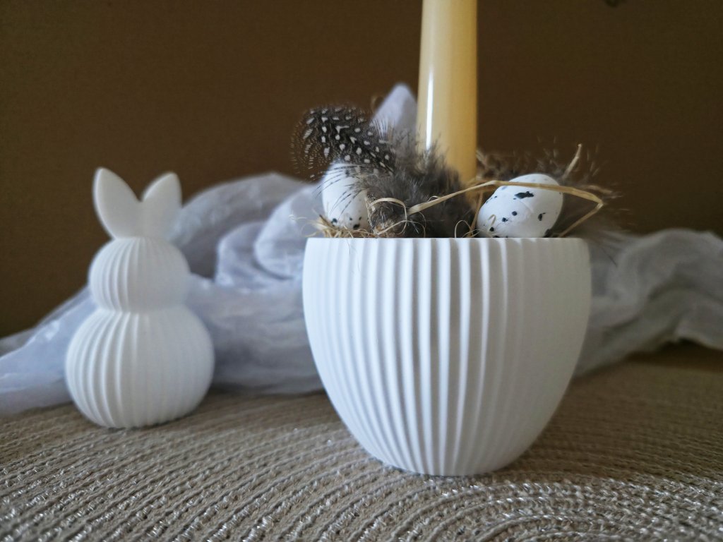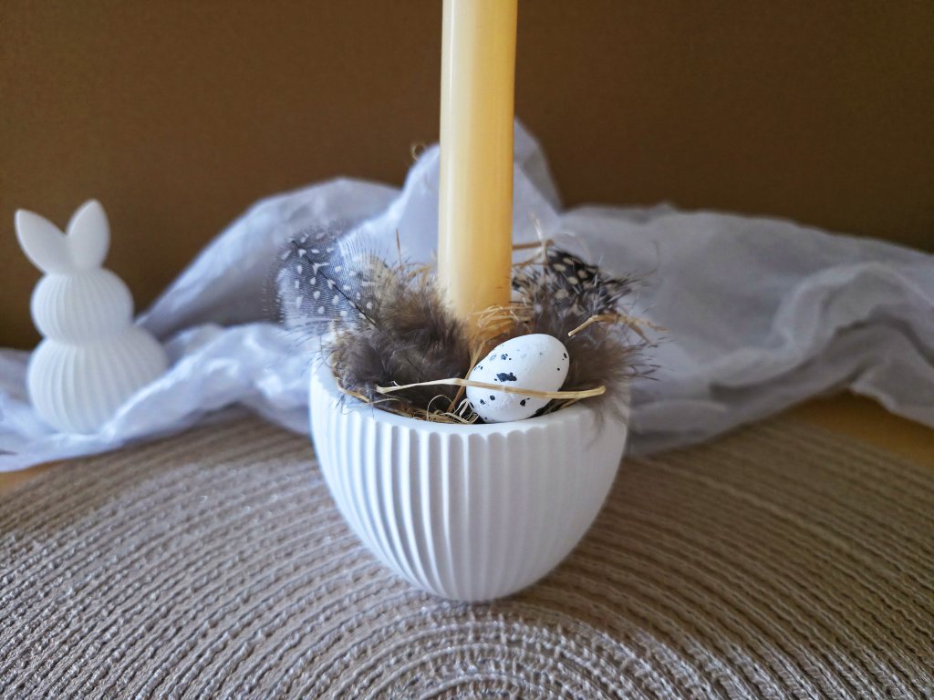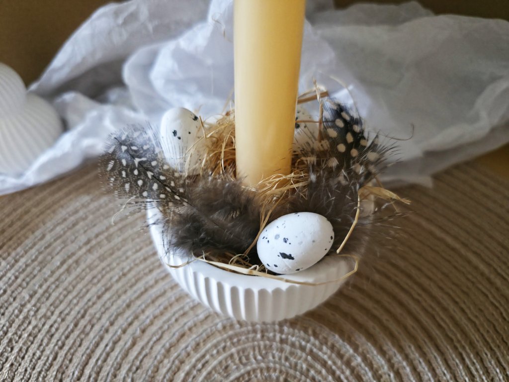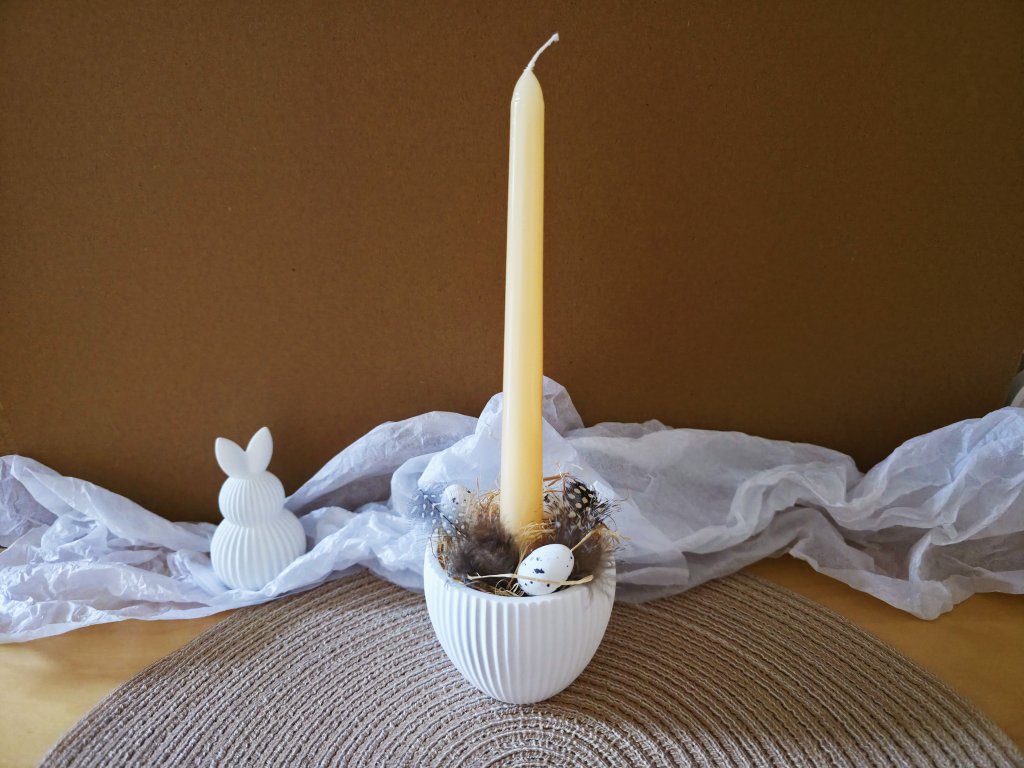 Součástí je svícen z minerální hmoty, dlouhá svíčka oranžové pastelové barvy, 3 ks vajíček, 2 peříčka a přírodní raffia - dřevitá vlna jako výplň.